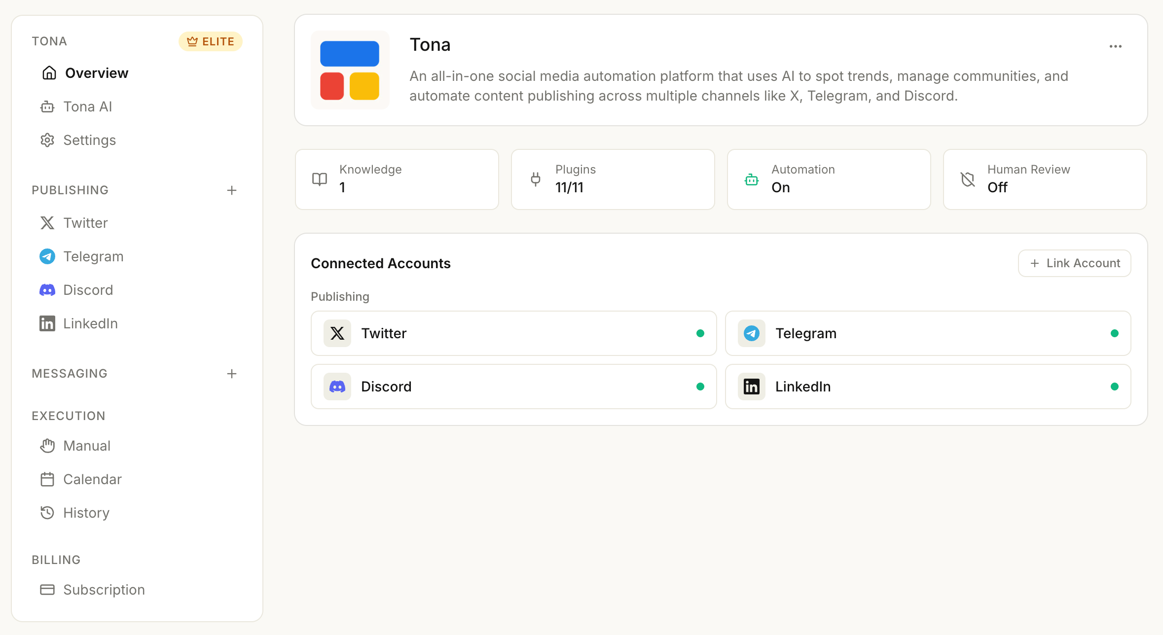TONA generates content, manages communities, and surfaces trends. Automatically.